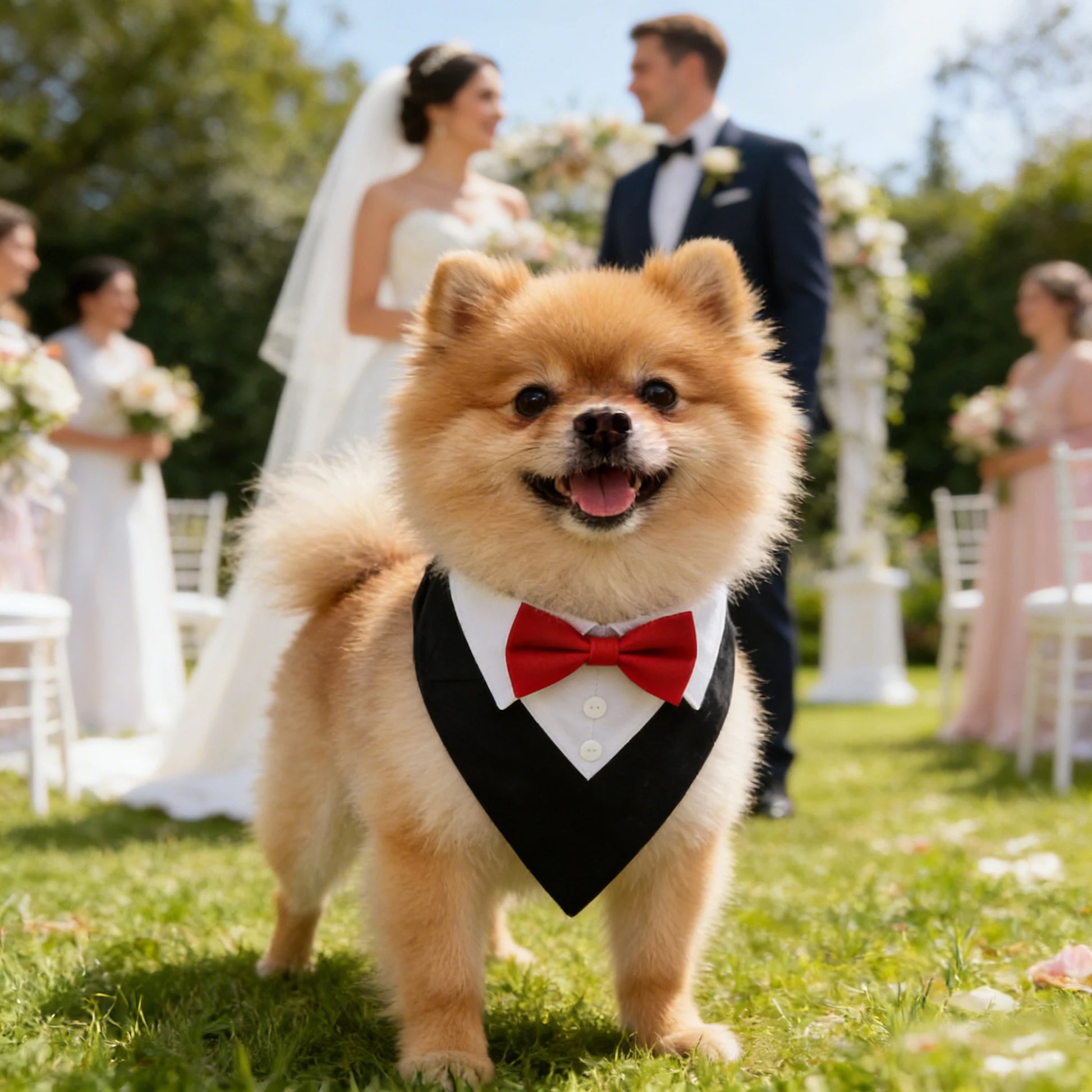 This versatile pet accessory features a classic bow tie attached to a comfortable triangle bandana collar that's easy to put on and take off. Available in multiple colors and three different sizes, it ensures the perfect fit for dogs of all breeds. The secure yet gentle design keeps your pet comfortable throughout any special event while maintaining that dapper, formal appearance.